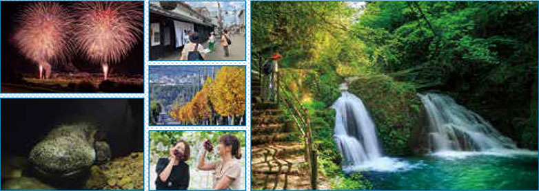 名張市は三重県の西部に位置する大阪と名古屋の真ん中にある人口約7万3千人のまちです。アクセスの便利さから、関西方面のベッドタウンとして急速に発展しました。歴史ある旧街道の町並みや里山の原風景が残る農村集落と、成熟した街並みが広がる住宅地が共存しています。景勝地として、伊賀流忍者が修行したとされる約4キロの遊歩道沿いにさまざまな滝が望める赤目四十八滝があります。渓谷や周辺の河川では、特別天然記念物のオオサンショウウオが生息するなど豊かな自然に恵まれています。盆地特有の気候から育まれた特Aのコシヒカリ米や地酒、ぶどうなどが特産品です。